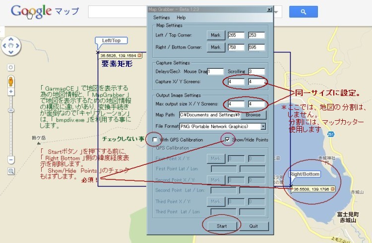 カシミール3Dでは、Fukuroさんのマップカッタープラグインがインストールされるので「カシミール3D」で表示できる地図はビットマップ画像として切り出す事が出来ます。しかし「カシミール3D」ではグーグル地図を表示できないのでグーグル地図の切り出しには「MapGrabber」を用います。「MapGrabber」は、GoogleMapから目的の場所を切り出します。切り出されたビットマップ地図(形式:.jpg,.png,.tiff)は、適当な変換ツールを用い、「.bmp」形式へ変換後、GarmapCEで使えるよう「bmpdiv」で分割し、同時に緯度経度を割り振ります。(キャリブレーション)。