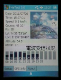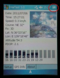 HaiTestを立ち上げ、GPS衛星電波の受信状況を確認します。(黒色の棒グラフが6本以上---多いほど良い---ある事を確認します。)