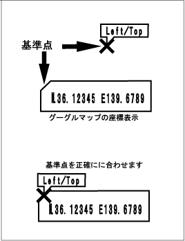 ・切り出しに際し、グーグルマップの機能を使い、要素矩形の左側上隅の緯度経度座標(Topポイント)と右側下隅の緯度経度座標(Downポイント)を表示します。 (操作方法 : マップ上で「Topポイント」としたい位置へカーソルを移動します。その位置でマウスを右クリックします。プルダウンメニューが表示されます。「緯度経度マーカーを配置」をクリックします。「Topポイント」の緯度経度が表示されます。Downポイントも同様に指定します。)